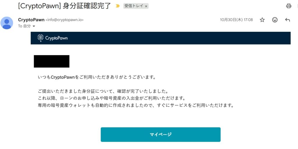 書類提出後、Crypto Pawnの運営側で内容を確認し、承認されると、こんな感じでメールが届きますよ。