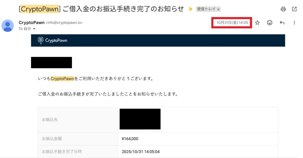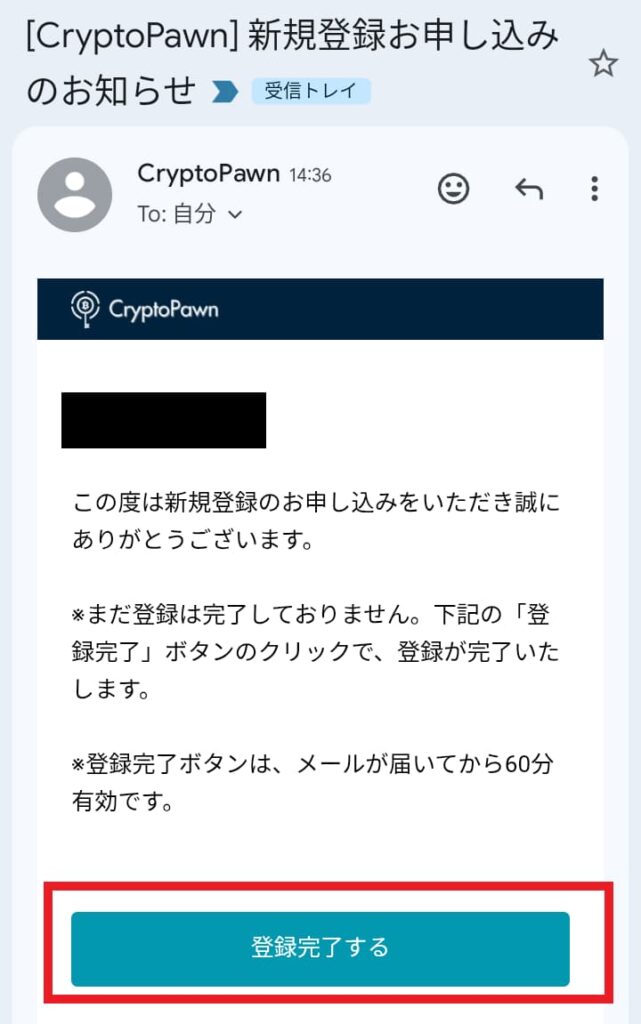 アカウント登録、契約書の送付、借入状況の通知など、Crypto Pawnからの重要な連絡はすべてメールで届きます。