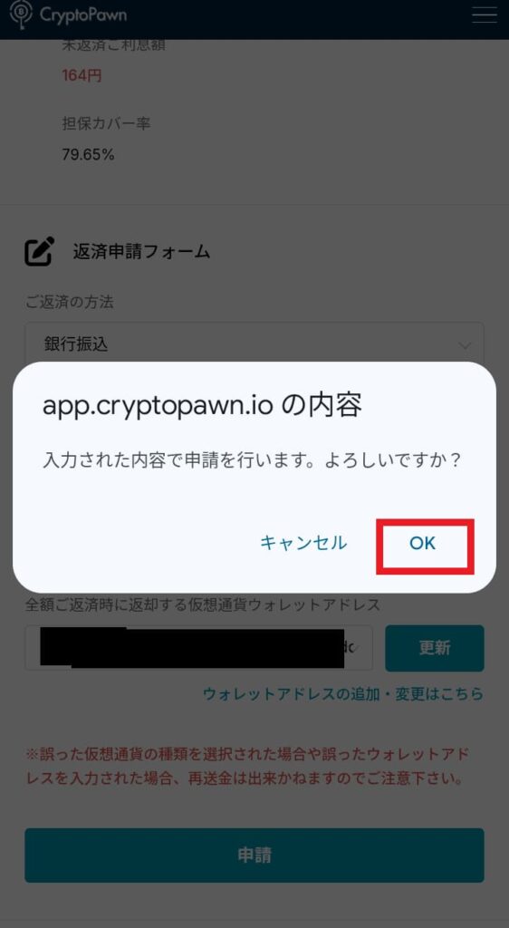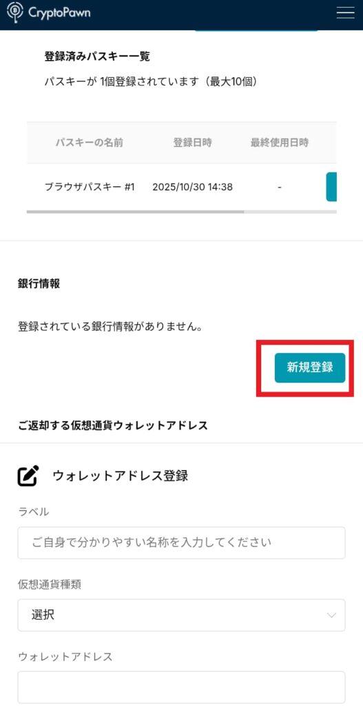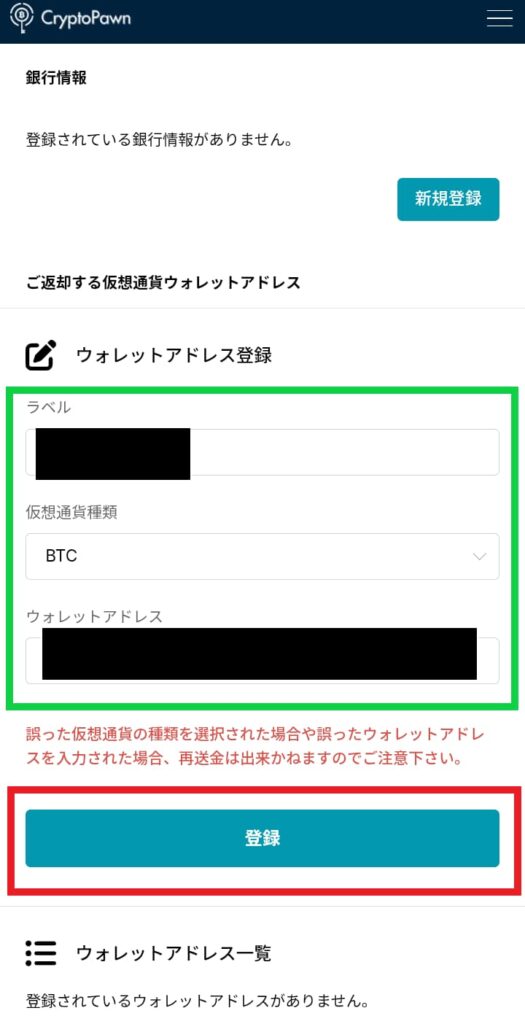 借入を完済した際、担保として預けた仮想通貨を返却してもらうために、ウォレットアドレスの登録もしておかなければなりません。