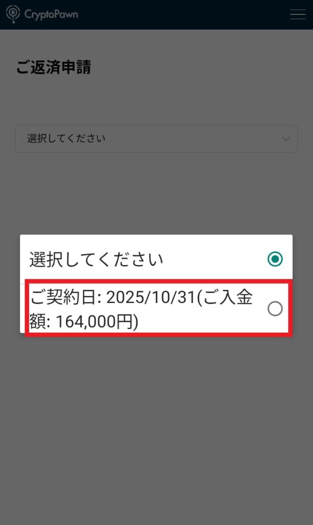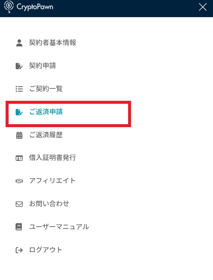 支払いは、管理画面の「ご返済申請」または上述した「利息支払いメール」からでも可能です。