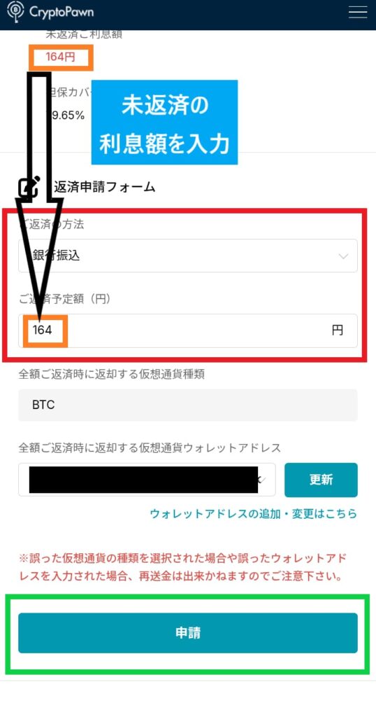 返済方法は、銀行振込もしくは仮想通貨でも返済できます。