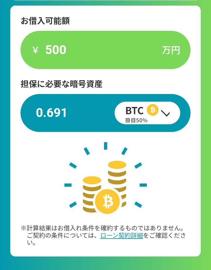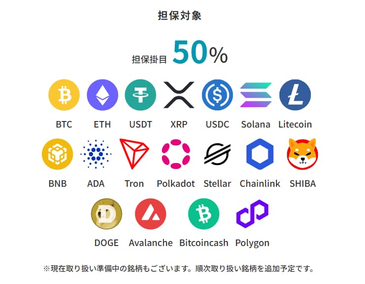 担保掛目は50%に設定されており、100万円分のビットコインを預けたとすると、最大50万円まで借り入れが可能です。