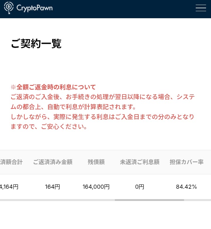 Crypto Pawnの金利は月利0.1%(年利1.2%)と、他の仮想通貨担保ローンサービスに比べても、非常に低水準ではあるものの、借入期間が長くなれば、それだけ利息の総額も増えていきます。