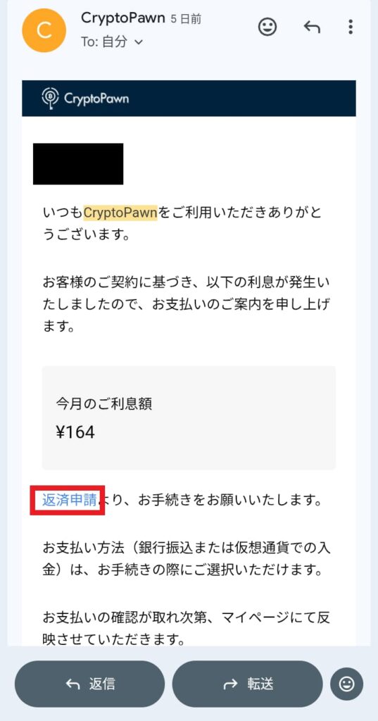 Crypto Pawnでは、月々の利息額がメールで届きます。