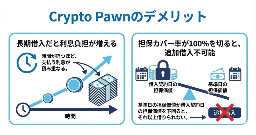 Crypto Pawnでは、価格下落による強制決済はありませんが、新規の借入もできなくなることから、不便になることは間違いありません。