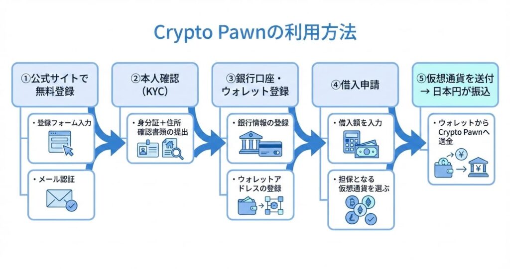 Crypto Pawnは、保有する仮想通貨を担保として日本円を借りられるローンサービスです。